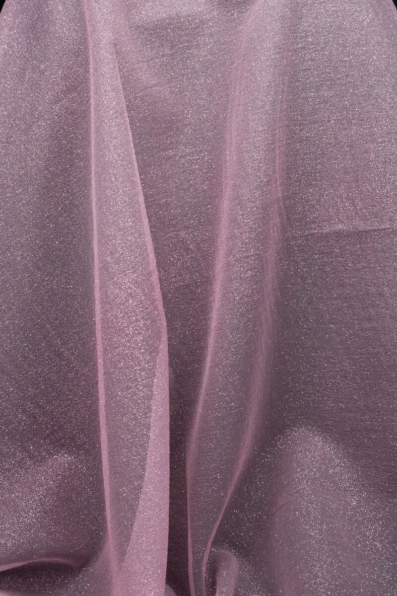 La struttura trasparente e impalpabile si unisce a un delicato effetto crepe, che dona al tessuto maggiore profondità e un aspetto sofisticato. I micro glitter, distribuiti in modo uniforme, creano una luminosità discreta e raffinata, capace di riflettere la luce con eleganza senza risultare eccessiva.