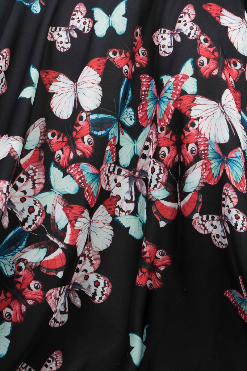 Tessuto stampato dal carattere vivace e raffinato, impreziosito da una suggestiva fantasia di farfalle multicolor su fondo nero.