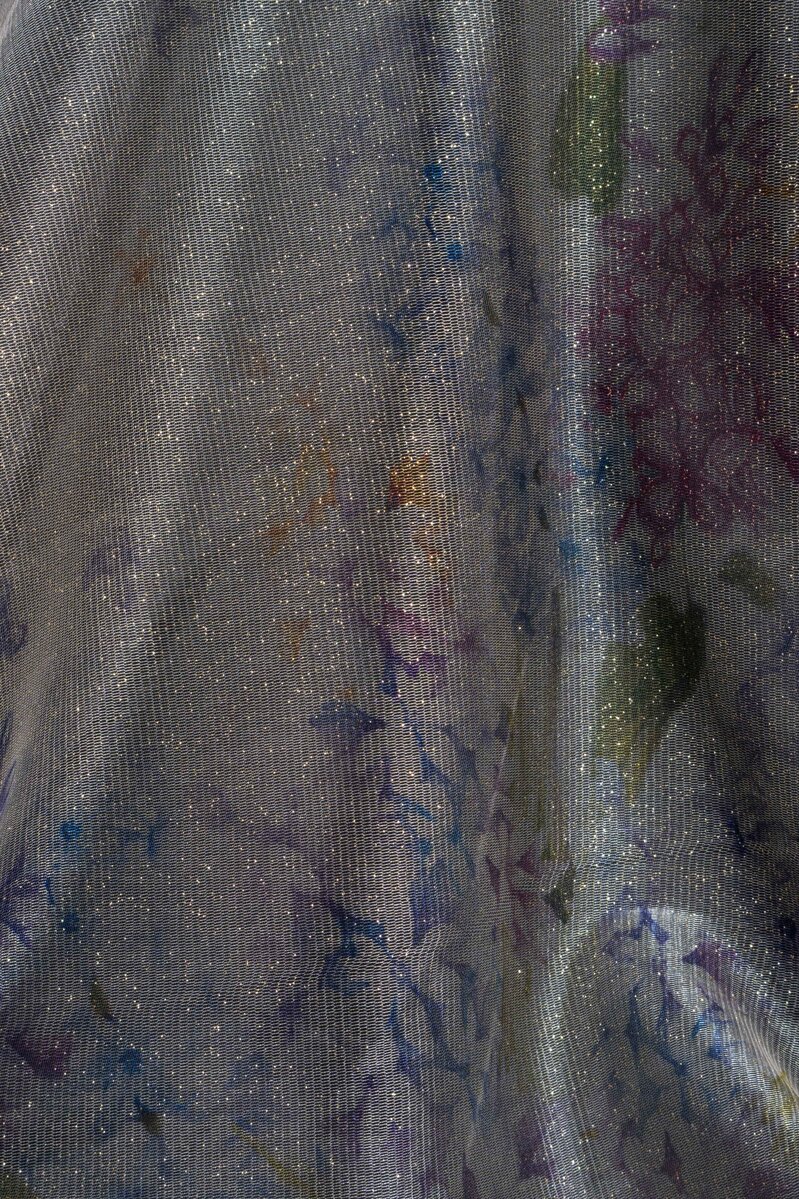 Tulle glitterato dal gusto romantico e raffinato, impreziosito da una delicata stampa floreale dai toni soft e sfumati.