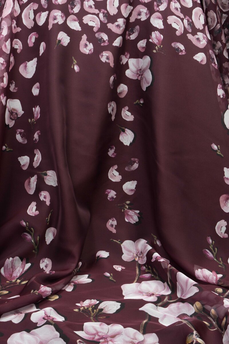 Voile stampato leggero e raffinato, caratterizzato da una suggestiva fantasia floreale su fondo bordeaux intenso.