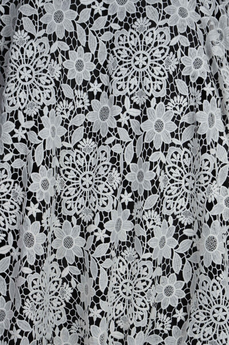 Macramè raffinato caratterizzato da un disegno floreale ricco e armonioso. I motivi, composti da fiori pieni e traforati creano profondità e un elegante gioco di pieni e vuoti. L’effetto complessivo è prezioso ed equilibrato, con una texture visiva ordinata e continua. Il tessuto risulta strutturato ma leggero, ideale per valorizzare capi eleganti e di alta gamma. Perfetto per abiti da cerimonia, sposa, cocktail e creazioni couture, si presta anche a inserti, maniche, corpini e sovrapposizioni scenografiche.
