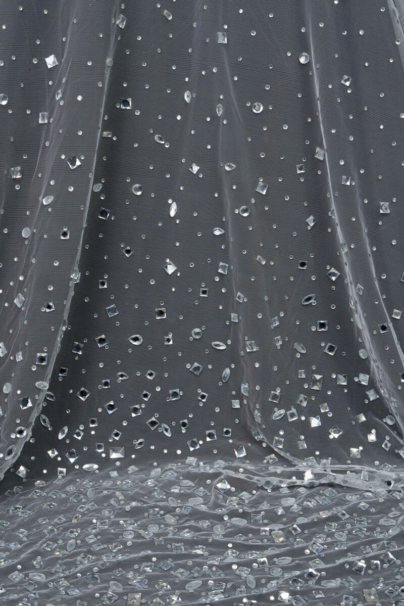 La base è impalpabile e trasparente, arricchita da una costellazione di applicazioni – tra cristalli, strass e micro elementi – distribuite in modo armonioso per creare un effetto luce intenso e sofisticato. Il risultato è un tessuto che cattura e riflette la luce ad ogni movimento, donando profondità e tridimensionalità.