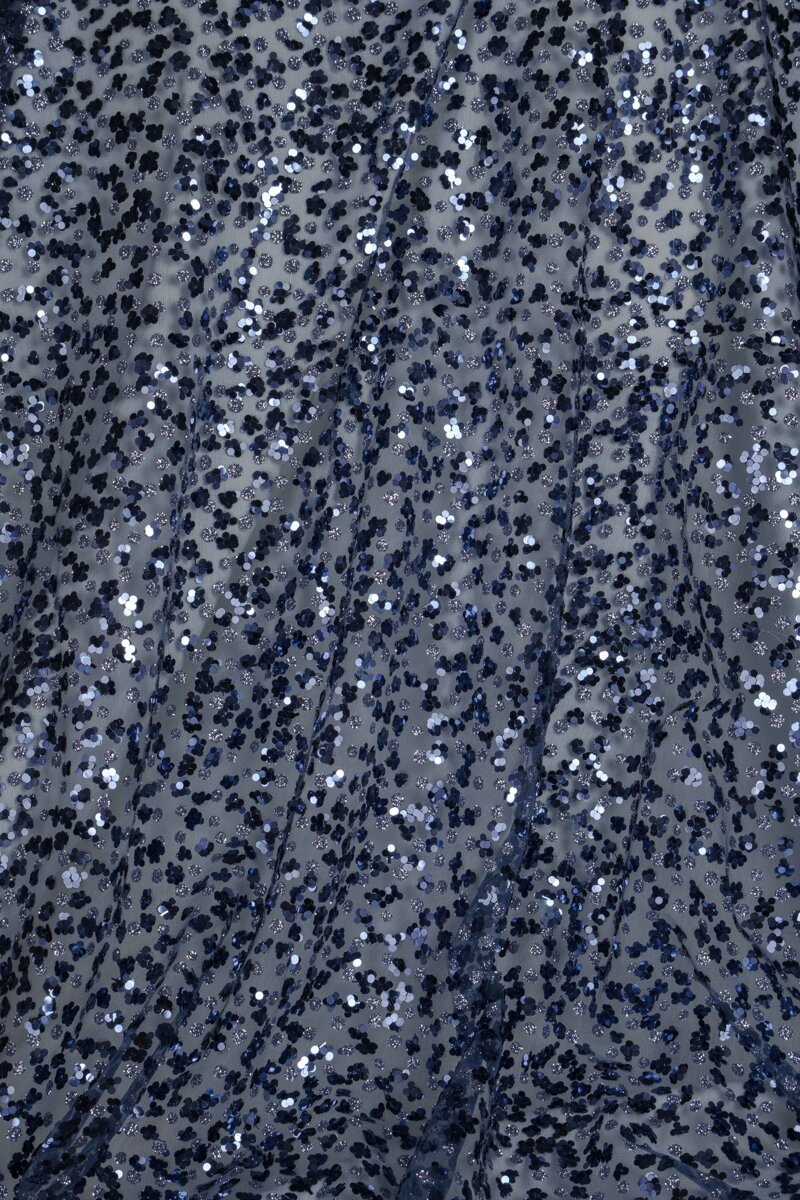 Raffinato tulle trasparente impreziosito da una fitta decorazione di paillettes e glitter nei toni del blu notte distribuiti in modo uniforme per un effetto luminoso e sofisticato. La base leggermente velata crea profondità, mentre paillettes e glitter catturano la luce donando movimento e brillantezza al tessuto.