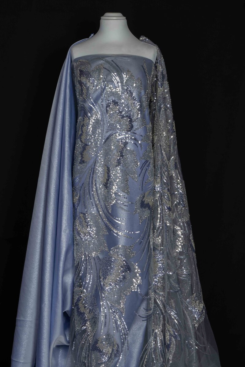 Tessuto di alta gamma caratterizzato da una base in tulle finemente strutturato, arricchito da un ricamo fitto e continuo con applicazioni luminose che creano un elegante gioco di luce e movimento. Il disegno, fluido e armonioso, si sviluppa in motivi sinuosi dall’effetto tridimensionale, conferendo profondità e preziosità alla superficie.
