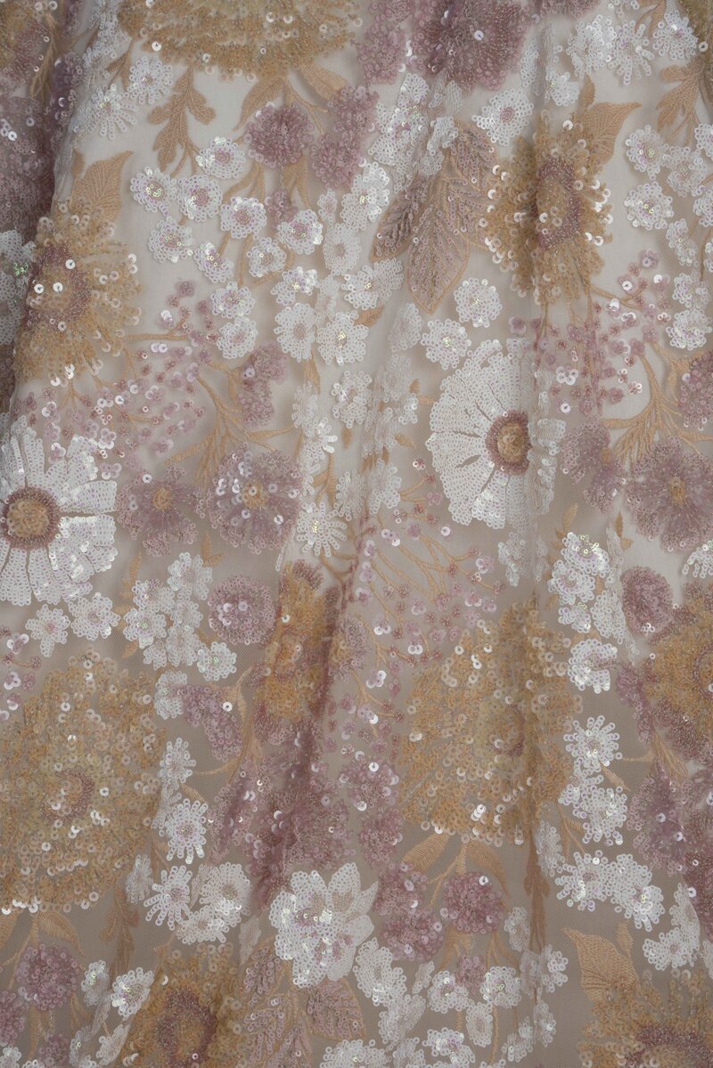 Un tessuto di grande eleganza e raffinatezza, ideale per creare abiti da cerimonia, abiti da sera o capi di alta moda. Questo tulle trasparente è impreziosito da un ricamo floreale dettagliato in tonalità delicate di rosa cipria, beige e bianco, arricchito da paillettes luccicanti che catturano la luce donando un effetto scintillante e raffinato.