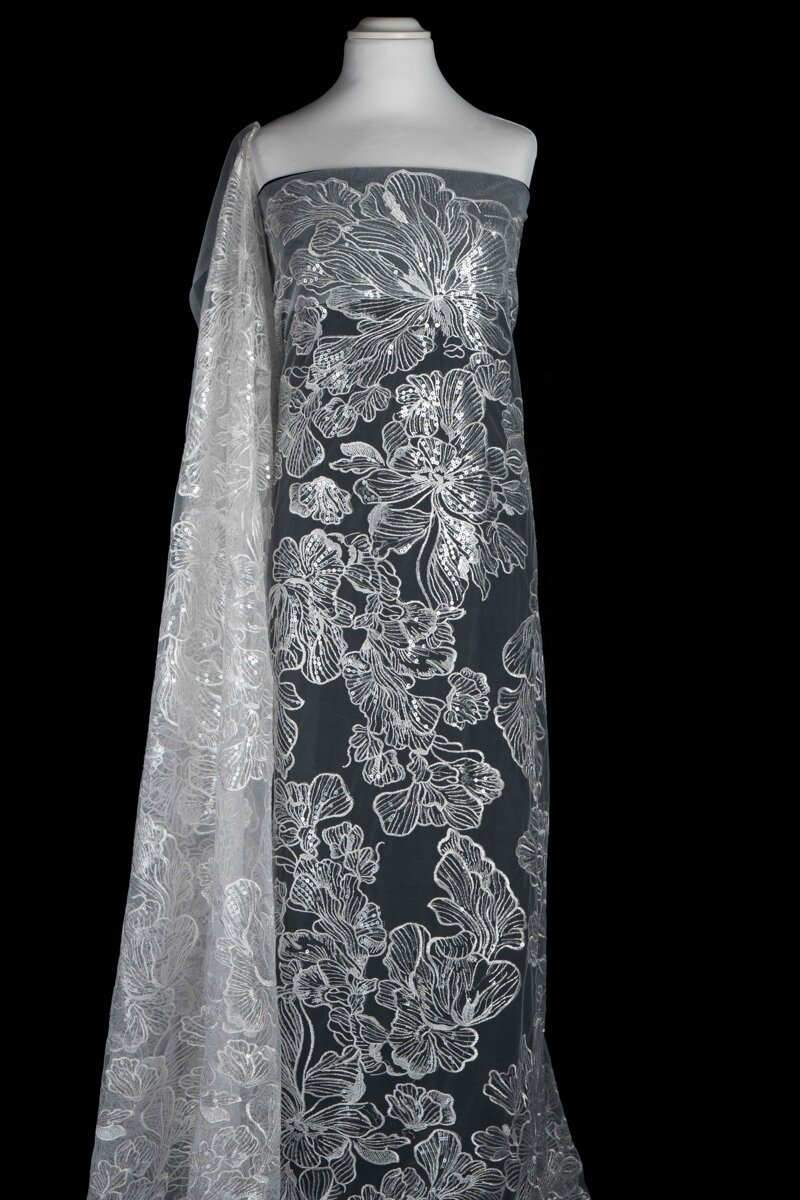 Pizzo di alta qualità realizzato su base tulle fine, impreziosito da un ricamo floreale fitto e armonioso. Il disegno è definito da un ricamo a filo che crea un delicato rilievo, arricchito da micro paillettes che donano luminosità elegante e controllata. La mano è morbida e fluida, con una trasparenza equilibrata che valorizza il motivo senza appesantire il capo.