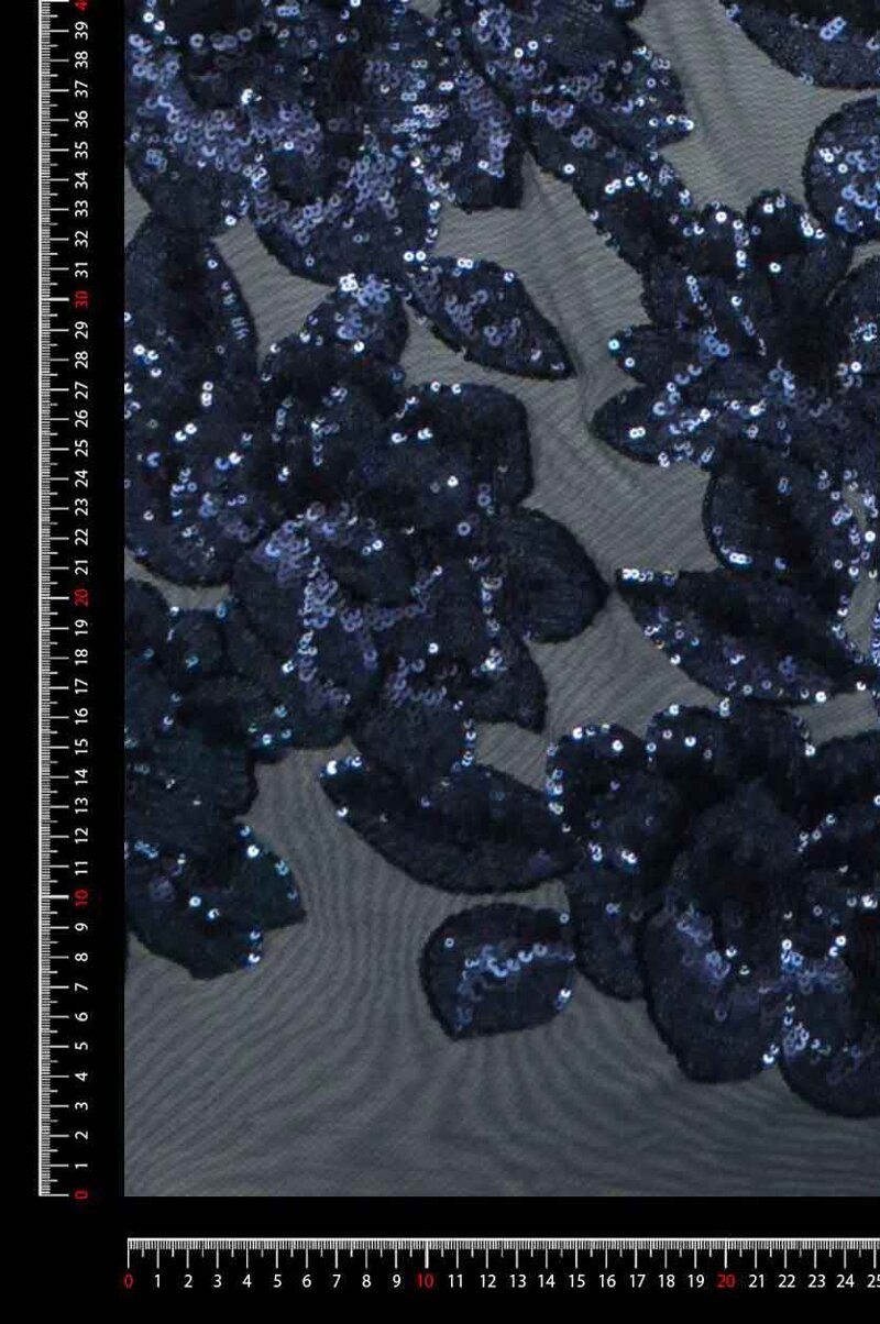 Tessuto di grande impatto scenografico, realizzato su base in tulle trasparente e arricchito da un ricamo floreale fitto e continuo. I fiori, in tono scuro, sono ricamati ed impreziositi da paillettes luminose che creano riflessi eleganti e profondi, donando movimento e luce alla superficie.